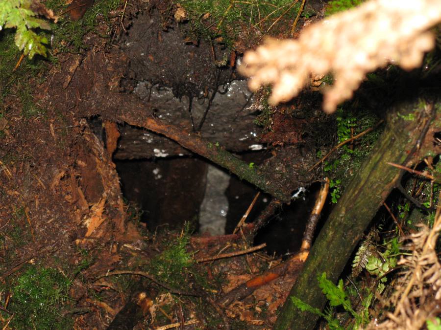 ich meine das Haus, dass man nur von der Wegabgewanten Seite einsehen kann. Soweit ich mich erinnere war von oben, also durch die Kellerdecke, ein Kreisrundes ausgemauertes Loch zu sehen. Die Gebäudereste hab ich von oben fotografiert, leider kann man auf den Bildern nichts erkennen. Durch das Gitter in einem Eingang hab ich dann ins Innere geblitzt. Auf diesen Fotos kann man sehen, dass der Bereich nach links (also in Richtung Schacht) abgemauert ist. Ebenso sind nach vorne (Westen) und nach rechts neuere Mauerwerke zu sehen.
