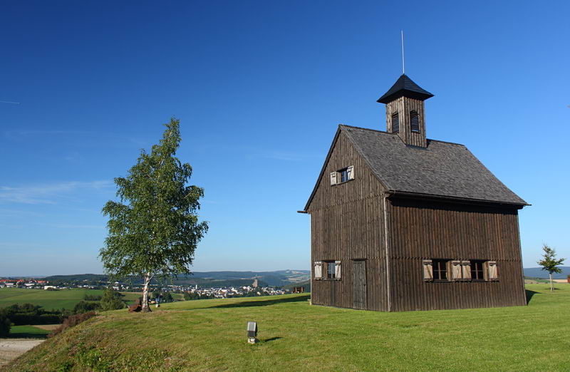 Das 2003 nach historischen Plänen rekonstruierte Treibehaus des Schindlerschachtes in Schneeberg /Neustädtel mit Blick auf Schneeberg im Hintergrund.