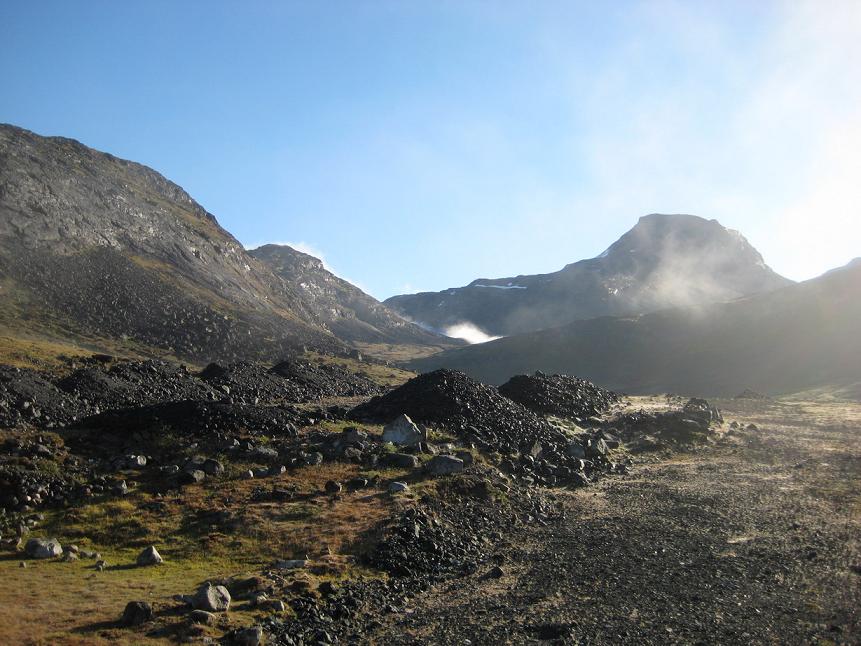 Mal eine Halde weit weg von Deutschland: Halden der Kvanefjeld Stollen, Ilimaussaq, Narsaq, Grunland mit Morgennebel und Sicht auf Mount Ilimaussaq (juli 2008). Stefan Ortel versteckt sich irgendwo in der Halde