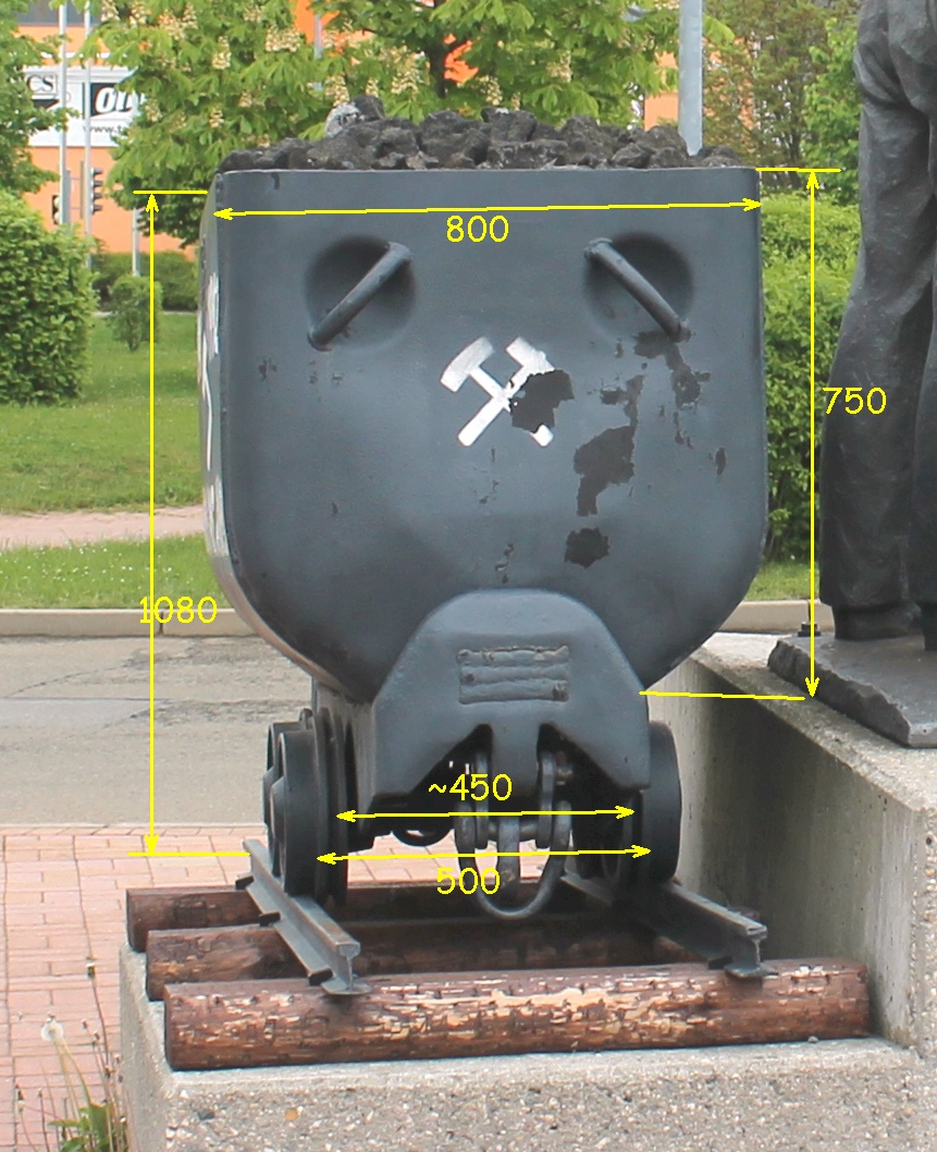 Es ist auf jeden Fall ein westdeutsches Fabrikat, den die meisten ostdeutschen hatten Gummiklötze in die Puffer eingesetzt bzw. waren aufgrund ihrer Form als typische Wismut-Wagen erkennbar. Von den Abmessungen her ist es ein Kleinförderwagen (Fritzsche, Bergbaukunde, 10. Auflage, S. 359), starre Radsätze deuten ebenfalls darauf hin. Vom Gewicht her würde ich 1/2 Tonne ansetzen. Bei 800 kg hätte ich in den letzten Jahren wohl arge Transportprobleme bekommen. Kupplung ist eine Pierburg-Kupplung. Aber auch da gab es Bergwerke wie der Rammelsberg, wo drei verschiedene Hakenkupplungstypen + Pilzkopfkupplung gemischt im Einsatz waren. Baujahr wahrscheinlich nach den 30er Jahren, vorher hatten sie es mit Schweißnähten nicht so.
