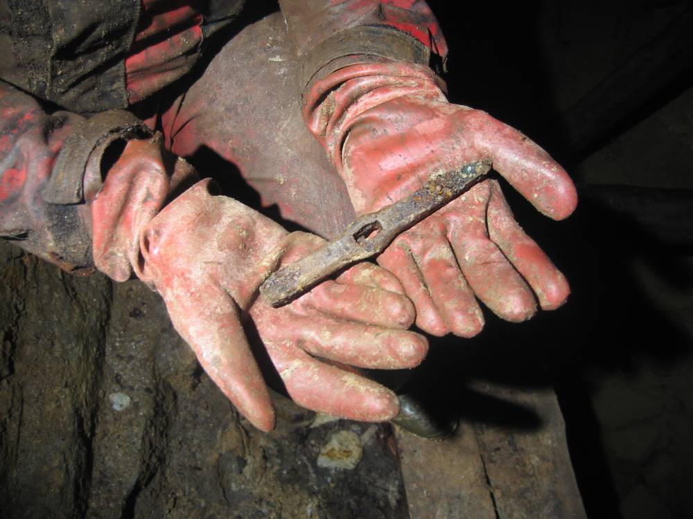 In den Fugen einer Grubenmauerung lag dieses schöne Bergeisen. Gefunden wurde dieses bei einer Fototour, während der Fotograf seine Fotoausrüstung aufbaute und die wartenden Befahrer sich in der Zwischenzeit etwas genauer die Mauerung betrachteten. In diesem Fall der Nobi