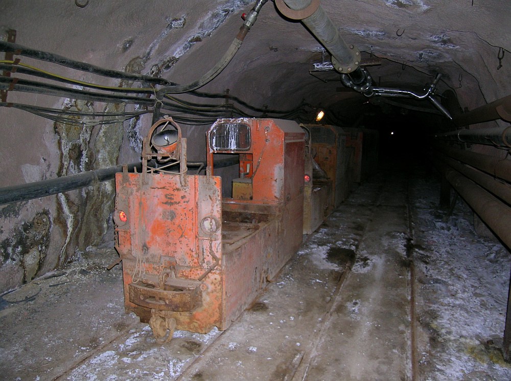 Richtig ausgewachsene Grubenbahnen haben (noch) die deutschen Steinkohlebergwerke zu bieten. Hier ein Bild vom Bergwerk West in Kamp-Lintfort. Zwei Züge stehen abfahrbereit im Personenbahnhof auf der 885m Sohle im Bereich der Schächte Friedrich-Heinrich 1/2. Die Schrammen im Lack sind Zeugnisse des rauhen Betriebsalltages, dem die Züge in der Regel ausgesetzt sind. Sie zeigen auch, dass die gängige "Dickblechbauweise" von Grubenbahnen durchaus ihre Berechtigung hat.