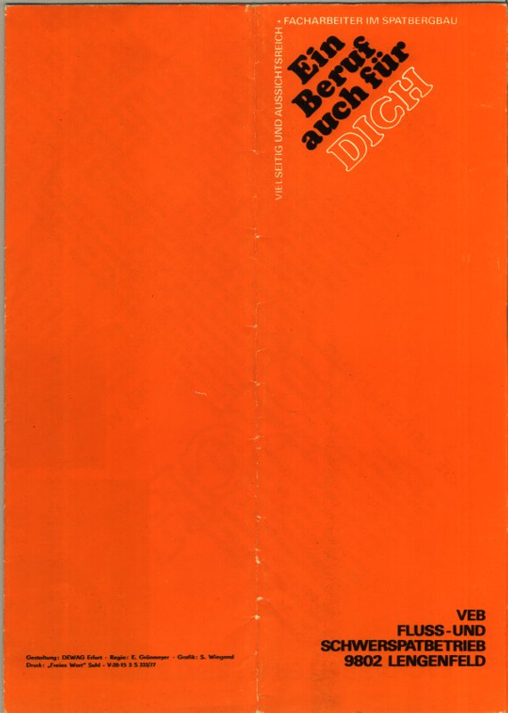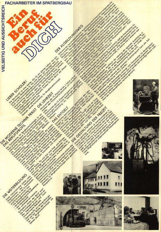 Beim Aufräumen im Bücherschrank fand ich dieses "fast" aktuelle Werbeprospekt des VEB Bergbau- und Hüttenkombinates Freiberg/Sa. 1977 wurden dringend Lehrlinge für den Bergbau gesucht. Dafür hat man sogar einen Prospekt in Farbe und auf Glanzpapier herausgegeben, trotz Mangelwirtschaft der DDR! Hier nun einige Auszüge über die wir sicher schmunzeln werden.
