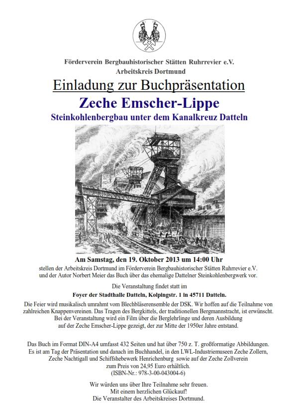 Am 19.10.2013 stellt Norbert Meier seine neuste Zechenmonografie "Zeche Emscher-Lippe Bergbau unter dem Kanalkreuz Datteln" vor.