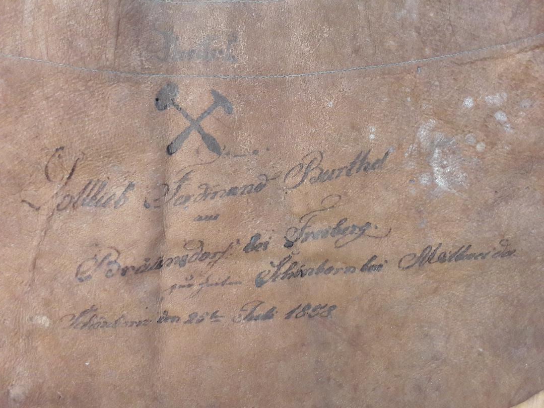 Im alten Bergbau ist die Verwendung von Leder auf wenige Gegenstände beschränkt gewesen. Wenn ich mich recht erinnere, dann sind das von den mit Nägeln versehenen Schuhen der alten Bergleute einmal abgesehen vor allem die Arschleder, die Tscherpertaschen, die bei der Anlage eines Bohrlochs über dieses Bohrloch gelegten Lederscheiben mit einem Loch für den Handbohrmeißel in der Mitte (Bohrdeckel), Lederkappen im 20. Jh und Teile der Pumpen. Als ich kürzlich eine Tscherpertasche gereinigt und konserviert habe, habe ich auf die Mittel zurückgegriffen, die ich jahrzehntelang als Handschriftenbibliothekar für die Reinigung und Konservierung von Ledereinbänden von mittelalterlichen Handschriften und Drucken bis zum 19. Jahrhundert habe anwenden lassen. Es gibt von der Firma Maroquin ein Reinigungsmittel mit dem Namen "Lederbalsam" und ein Pflegemittel namens "Ledervaseline". Diese Mittel werden vor allem von Museen und Bibliotheken angewendet. Man kann den Lederbalsam mit einem Schwämmchen einreiben oder mit einem Pinsel auftragen. Ich habe die Reinigungsflüssigkeit mit dem Pinsel aufgetragen, vielleicht eine halbe Minute einwirken lassen und dann mit einem sauberen, weißen Baumwolltuch die bearbeitete Lederfläche abgerieben. Wenn das Tuch keine braunen Flecken mehr auswies, dann habe ich die Fläche für sauber erklärt. Ich war überrascht darüber, daß das dicke Leder derart weich wurde. Bei Trocknen wurde das Leder wieder fest. Nachdem die Reinigungsflüssigkeit nach zwei Tagen ganz getrocknet war, habe ich das Leder mit der Ledervaseline eingerieben. Ich habe die Vaseline mit dem Finger aufgetragen. Ich glaube, daß die Wärme des Fingers die Vaseline leichter flüssig macht. Danach habe ich in einem warmen Zimmer die Vaseline zwei Tage lang einziehen lassen und den nicht eingezogenen Rest der Vaseline mit einem weichen Tuch abgerieben.