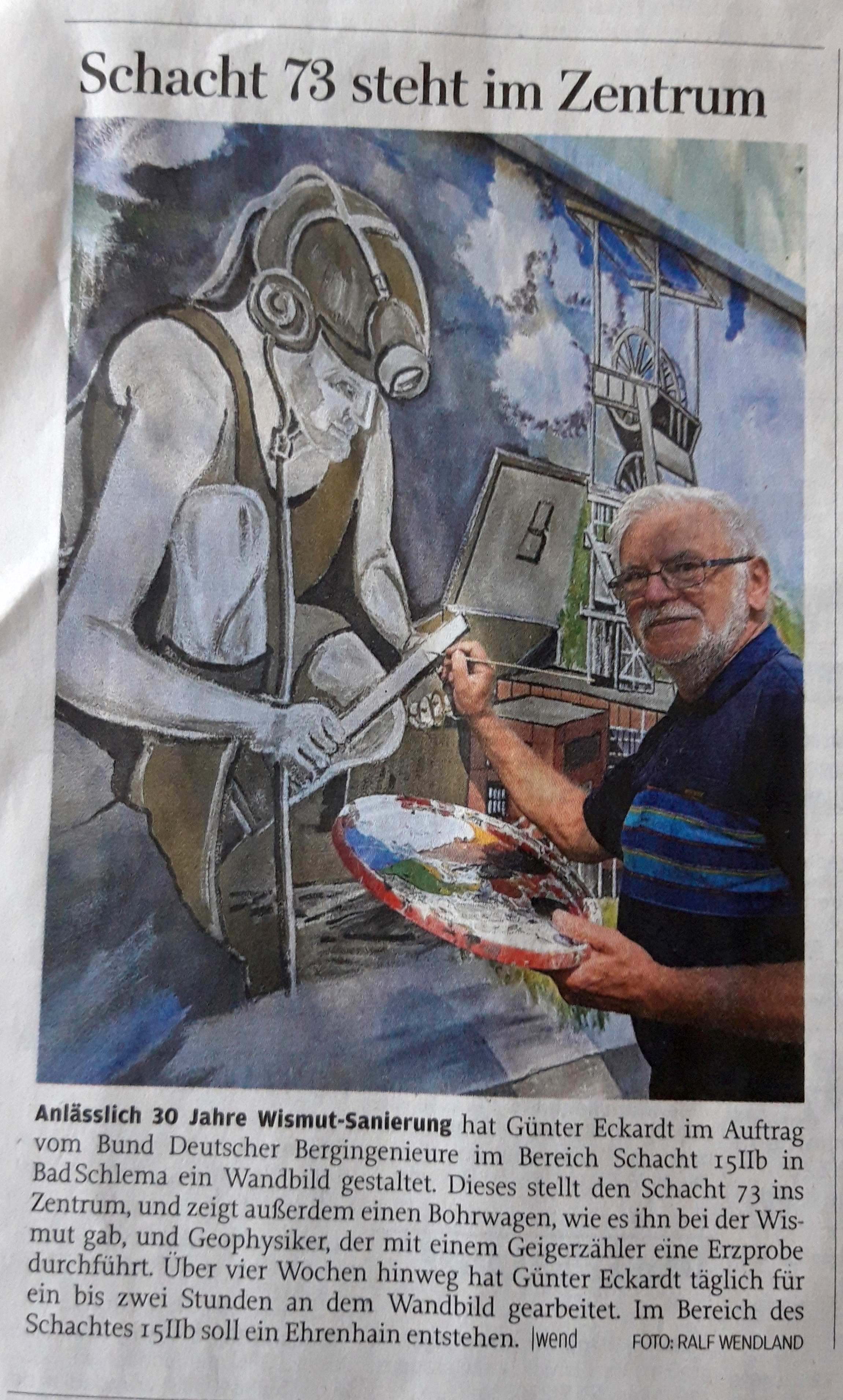 Wie die Freie Presse aus gut unterrichteten Kreisen erfahren konnte, war die Geheimhaltung der Wismut so groß, daß jetzt erst Dokumente zu dem bisher völlig unbekannten Schacht 73 veröffentlicht wurden. Da die alten Fotos immer noch der höchsten Geheimhaltungsstufe (VLV; vor Lesen vernichten) unterliegen, wurde die gigantische Anlage auf einem Wandbild des weltberühmten Künstlers G. E. dargestellt, um den Lesern der Freien Presse einen ersten Eindruck zu vermitteln.