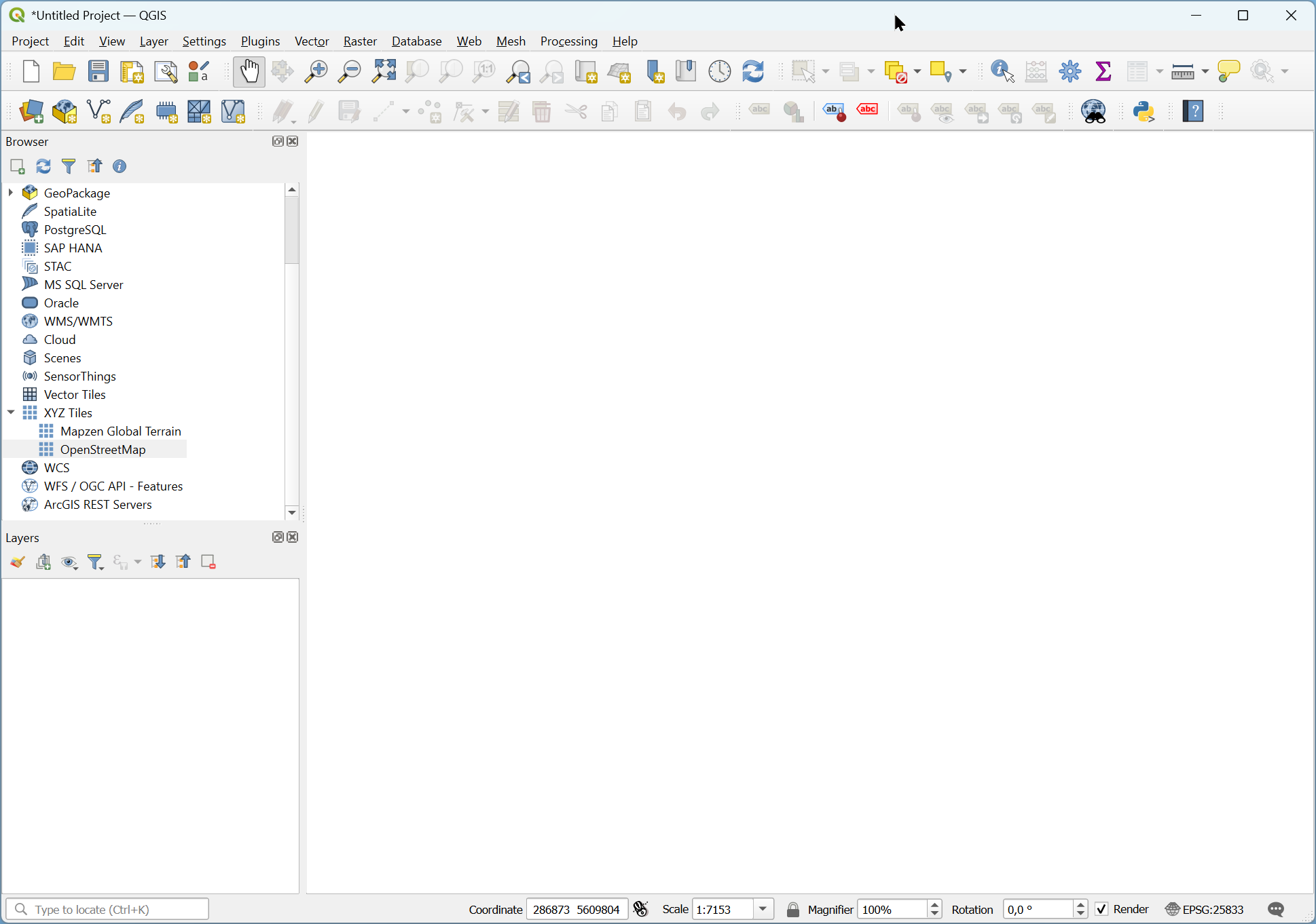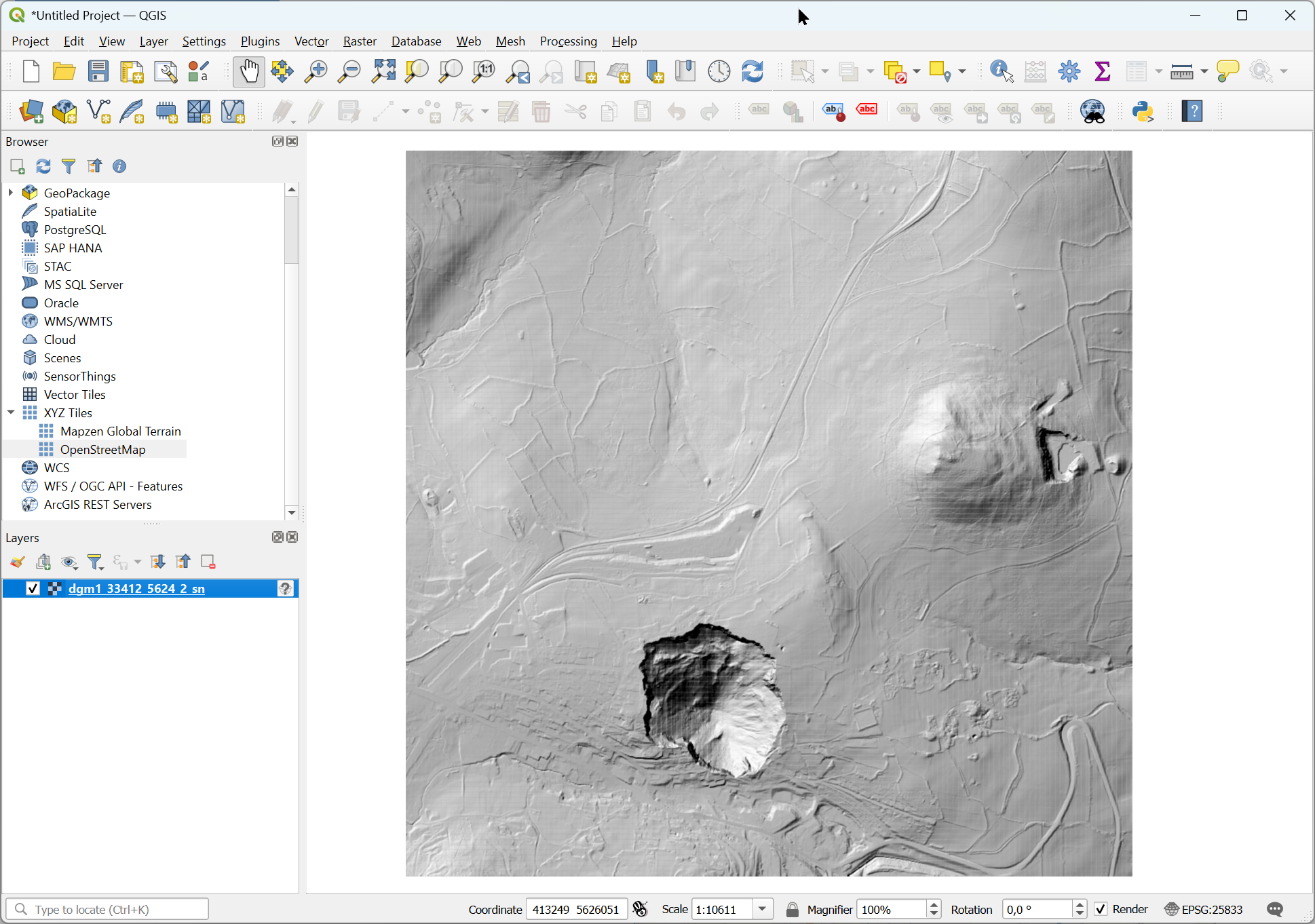 3. QGIS starten, sollte etwa so aussehen: 4. Jetzt die xyz-Datei mit der Maus anklicken und mit gedrückter Taste in den Darstellungsbereich ziehen. In der voreingestellten Form kann man allerdings kaum Strukturen erkennen: 5. Jetzt mit der rechten Maustaste unten links im Layer-Fenster auf “dgm1_…” klicken und “Properties”/“Eigenschaften” anklicken. Es erscheint folgendes Popup-Fenster: Dort klickt man links auf “Symbology”/“Darstellung” und wählt oben im Auswahlfeld “Render type” die Darstellung “Hillshade”/“Schummerungskarte” aus. Dann auf OK klicken und schon hat man die gewünschte Reliefkarte: Mit einem Rechtsklick in die Karte kann man direkt Koordinaten extrahieren.