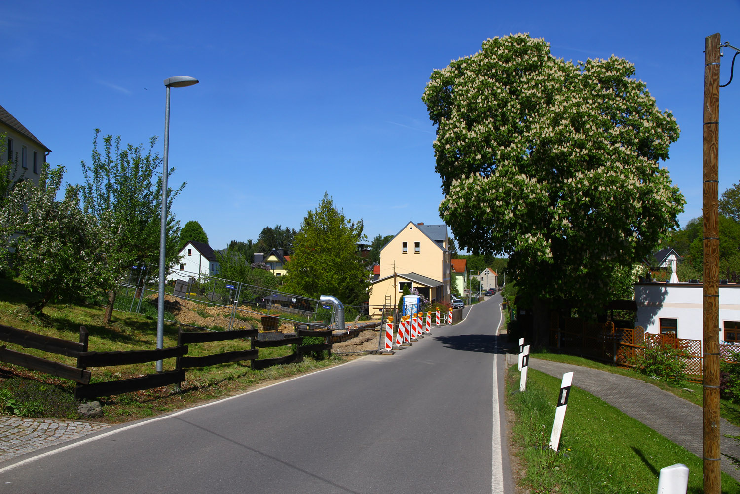 Bereits seit vorigem Jahr werkelt die Bergsicherung Sachsen in Stenn bei Zwickau - auf freiem Feld und in der Ortslage. Schon die Anzahl der Stellen, an denen Schilder, Markierungspflöcke, Bauzäune usw. stehen und nicht zuletzt das Huthaus lassen vermuten, dass das eine größere Sache ist. Leider hab ich in der Freien Presse keinen Artikel dazu gefunden, der irgendeinen Hinweis oder Erklärung gibt.
